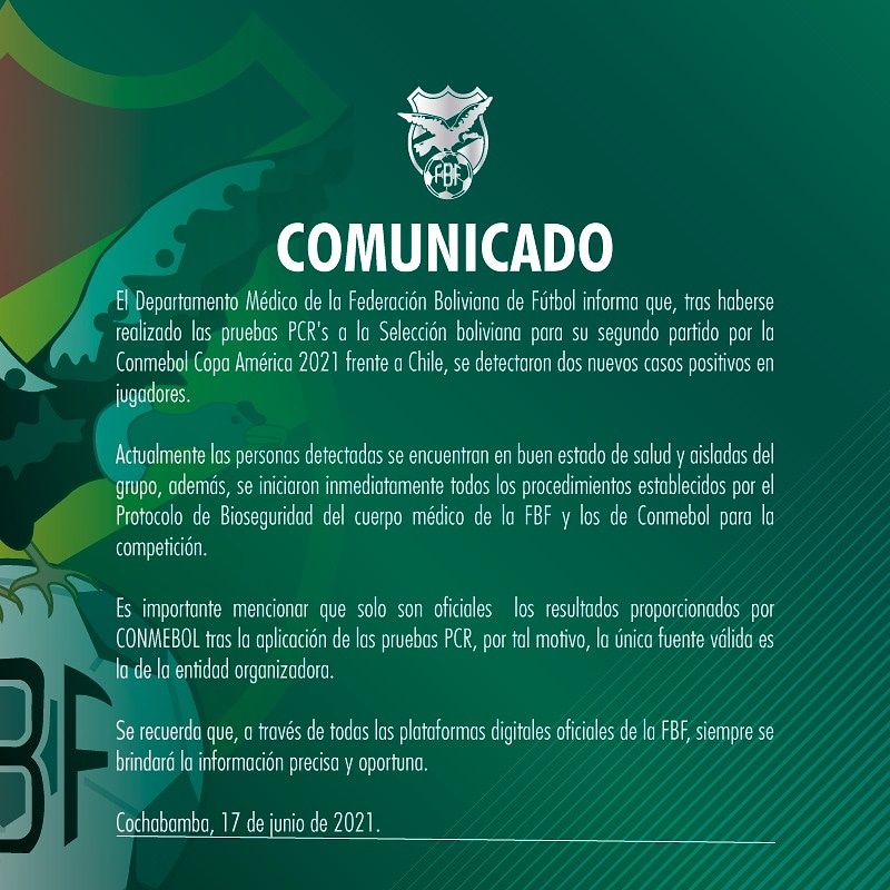 La Federación Boliviana de Fútbol (FBF) informó este jueves que se presentaron dos casos positivos en la Selección nacional, sumando a la fecha cinco durante su participación en la Copa América Brasil 2021.