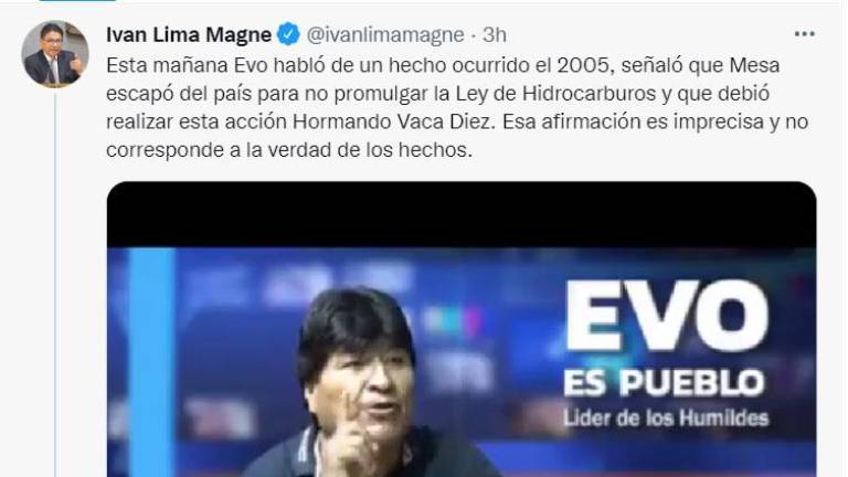 “Esta mañana Evo habló de un hecho ocurrido el 2005, señaló que Mesa escapó del país para no promulgar la Ley de Hidrocarburos y que debió realizar esta acción Hormando Vaca Diez. Esa afirmación es imprecisa y no corresponde a la verdad de los hechos”, escribió.