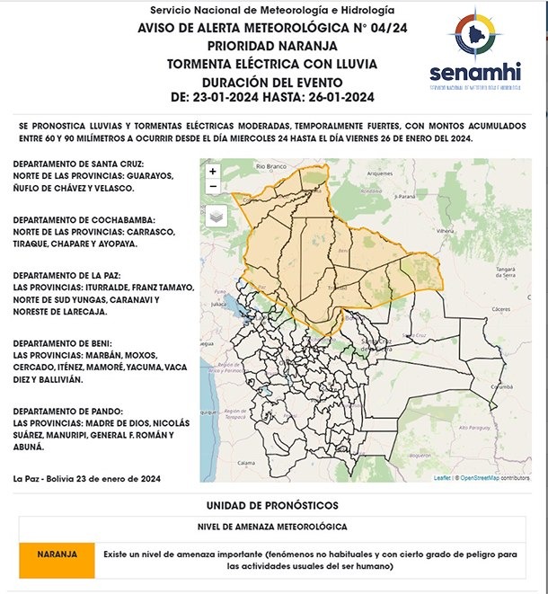 “Se pronostica lluvias y tormentas eléctricas moderadas, temporalmente fuertes, con montos acumulados entre 60 y 90 milímetros a ocurrir desde el día miércoles 24 hasta el día viernes 26 de enero de 2024”, informó Senamhi en sus redes sociales.